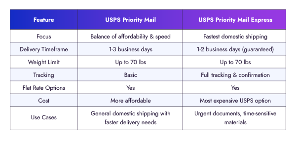 - Generally the most expensive domestic shipping option from USPS.
