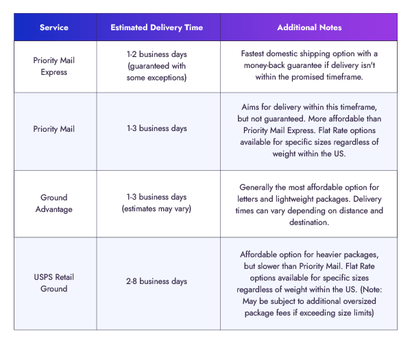 USPS Priority Mail offers a balance between affordability and speed for domestic shipping.Delivery Timeframe: Aims for delivery within 1-3 business days.Weight Limit: Up to 70 lbs.