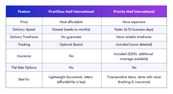 - Budget: If affordability is the top priority for lightweight documents or letters, First-Class Mail International can be an option.