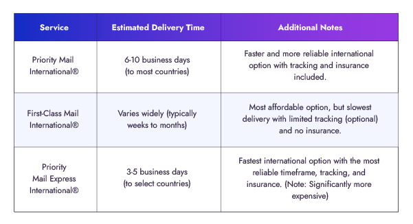 - More reliable timeframe: Offers a more predictable delivery window compared to First-Class Mail International.